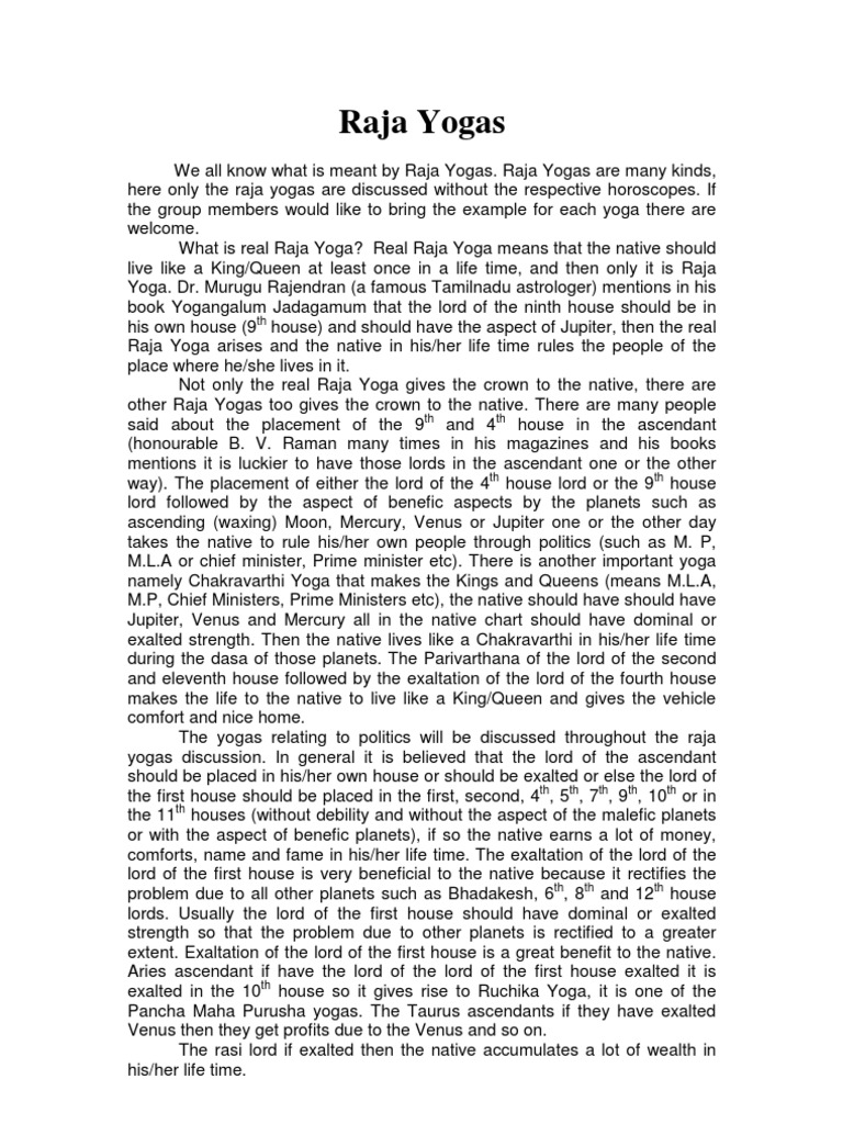 What Does Raja Yoga Mean In Astrology? (Question) - Yoga in Ashland and ... Raja Yoga is thought to be extremely auspicious in Kundli, and it is believed to aid the local in achieving all of his or her goals in life. Because of this, a local can have a royal life, which entails having power and luxury as well as authority and prosperity, among other things. Raja yoga might be confusing. Here's what you need to know.
