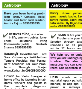 Deccan Chronicle Astrology Ad Rates and Online Booking for ... Sample Ads For Deccan Chronicle Astrology : Poojas - We do all types of Poojas, Yantras & Mantras for Prosperity, Wealth, Education, Business and Life, please Contact 0000000000. Personal Problems - Are you Sick, jobless, poor in Education, unable to find a partner or your love, no peace, obstacles, no children?