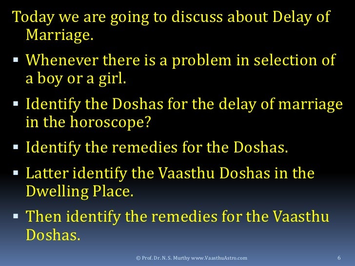 What to do if marriage is late: Dr Vinay Bajrangi - DNA India Dr Vinay Bajrangi - There are two types of reasons for a delay in marriage. One, some specific planetary position in your horoscope for late marriage. Second, the reasons created by the person him/herself, the relatives and some other compelling circumstances or maybe some other priorities resulting in delay of marriage.