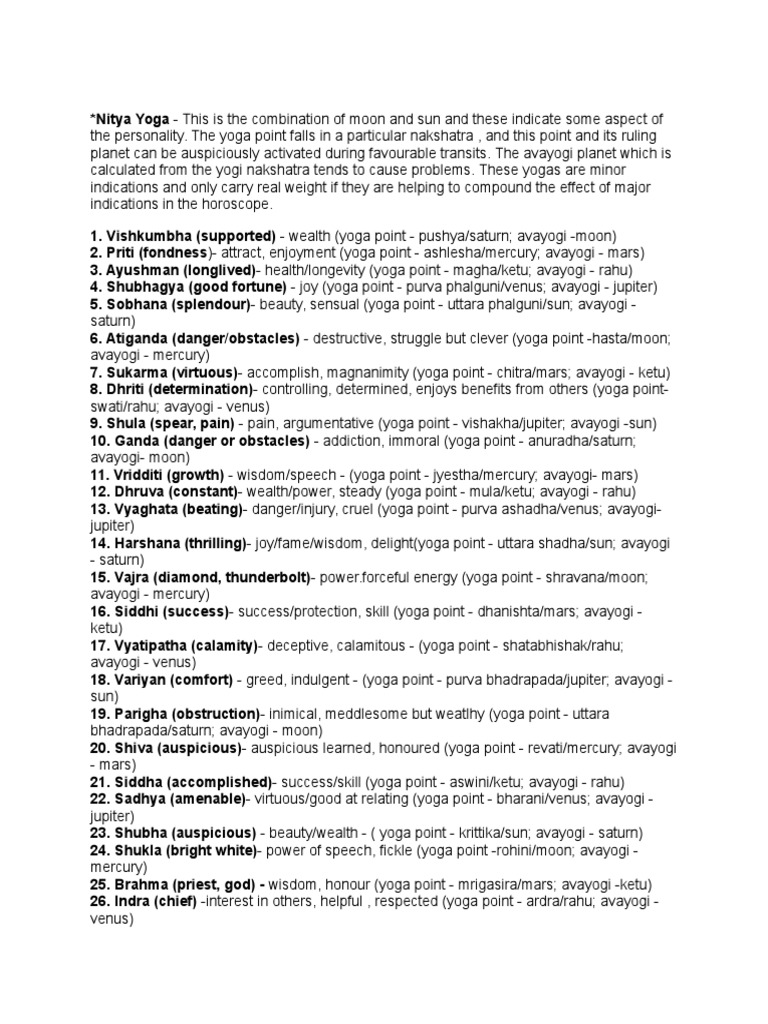 27 Yoga or Nitya Yoga - 27 Yoga or Nitya Yoga,nitya yogas in astrology ... 27 Yoga or Nitya (Birth) Yoga 1.Vishkumbh Yoga - (Supported) Though astrology considers it inauspicious but natives born in this yoga may possess best qualities and good fortune. They are usually very beautiful and intelligent. They do not have to face any financial problems as they are financially secure. What is the importance of the 27 yogas in astrology? What ... - Quora Answer: What ever I have learnt and read it dosent give much impotance of Birth in Yoga,Yogas are Given Imporance in event that one is going to take up in near future.Birth is seen from Horoscope,Nakshtra,Yoni,Gan and so on,I amy be wrong ,there may be Liturature on your question but I have not c... 27 Birth Yogas, Muhurta Yogas, Yoga in Panchang - AstroDevam.com 27. Vaidhriti: Divisive- (dangerous, conniving nature; influential and irresistible mentally or physically.) As one can see, the result of Yogas are in accordance to the name given to them. Vaidhriti and Vyatipaat Yogas are to be avoided in all auspicious acts.