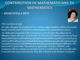 Shakuntala Devi | PDF | Teaching Mathematics | Cognition - Scribd de 1 Shakuntala Devi Shakunatala Devi is a well-known mathematical genius and calculating progidy from India. She has been nicknamed 'Human Computer' because of her extraordinary talent and skill in solving complex mathematical problems without any mechanical aid. Shakuntala Devi was born on 4th November, 1939 in Bangalore, Karnataka, India.