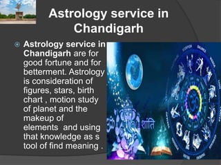 Best Astrologer in Chandigarh - Astrology Services in Chandigarh ... Astrology Services in Chandigarh. Famous Astrologer in Chandigarh has all the capacities for settling a wide range of issues which happen in affection relationship, wedded life and love marriage. Love relationship and marriage are the most significant relations of our life and when any sort of issue occur in these relations the circumstances ...