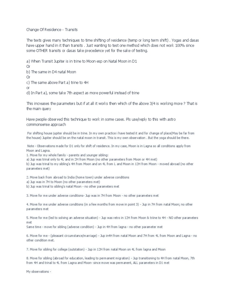 Change of Residence | PDF | Hindu Astrology | Jupiter - Scribd of 2 Change Of Residence - Transits The texts gives many techniques to time shifting of residence (temp or long term shift) . Yogas and dasas have upper hand in it than transits . Just wanting to test one method which does not work 100% since some OTHER transits or dasas take precedence yet for the sake of testing.