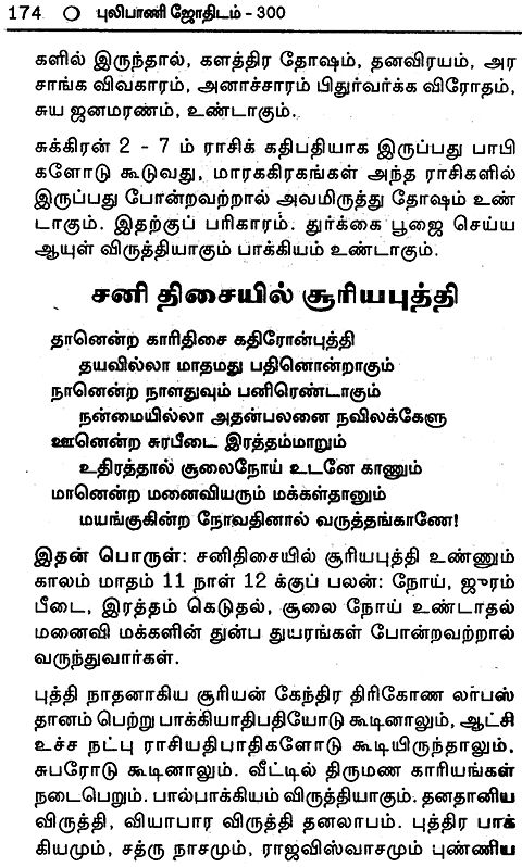 புலிப்பாணி ஜோதிடம் 300 - Pulippaani Astrology - Astrology Articles ... புலிப்பாணி ஜோதிடம் 300 (Pulippaani Astrology 300) புலிப்பாணி என்பவர் பதினெண் சித்தர்களுள் ஒருவர். இவர் பழனி மலையில் ஜீவ சமாதியான போகரின் சீடர். போகரின் தாகம் தீர்க்க புலியின் மீது அமர்ந்து நீரெடுத்து வந்ததால் (புலி + பாணி) இப்பெயர் பெற்றார். Buy Best Natural Therapies Books Online - giri.in WebTamil Nadu - 605602. Phone: 91-9842387921; JAYA NAGAR. Video Call Shopping is Now Open,Save & Call: 9566058070 / 7899672358 # 652, 11th Main 5th Block, Jayanagar, Diagonally Oppsite to Sri Raghavendra Swamy Mutt , Bangalore - 560041. Timings: 09:00 AM to 09:00 PM IST. Phone: 91-9566058070 Open Today Works on from Sunday to … Pulippani Jothidam: 300 Astrological Rules from an Ancient Tamil ... Pulippani Jothidam: 300 Astrological Rules from an Ancient Tamil Classic by N.S. Natarajan [SA] Availability: Big amount Price: ₹ 399.00 excl. shipping costs Net price: ₹ 399.00 excl. shipping costs Price in other stores: ₹ 399.00 pcs Add to cart add to wish list Rating: Publisher: Saptarishis Publications Product code: SBS00003308 Pulippani astrology / Pulippani Jothidam - Saptarishi Jothidam Pulippani astrology Sage Pulippani was one of the enlightened beings (called siddhar in Tamil) who wrote on astrology. In his 300 Tamil verses on astrology, he describes the basics and important principles of Indian astrology. He was a disciple of sage Bogar, who lived before the start of the Common Era.